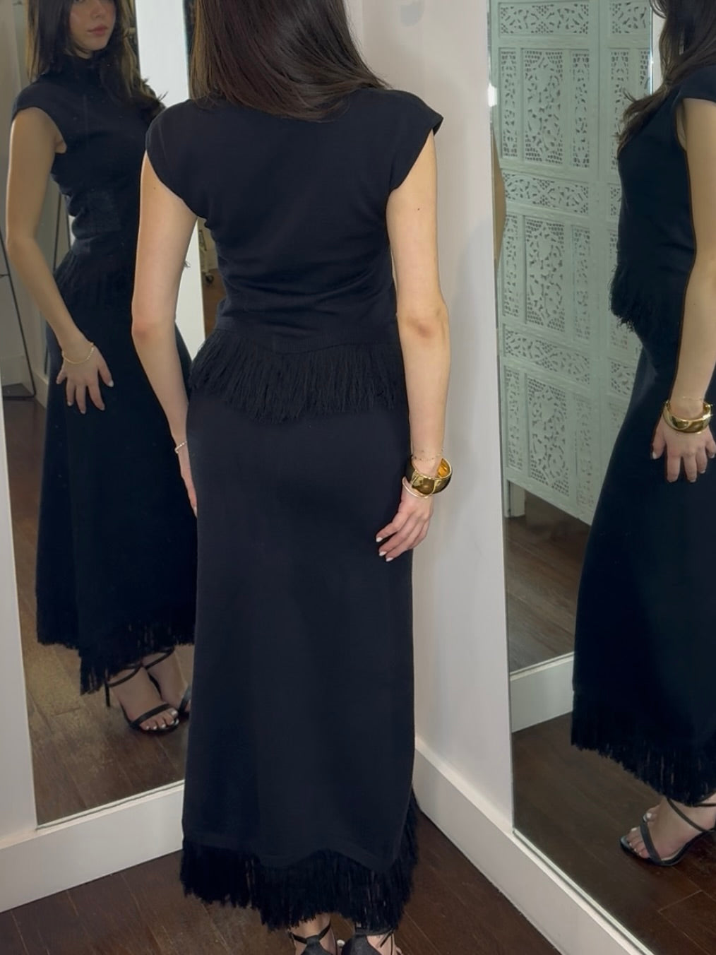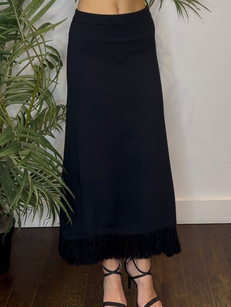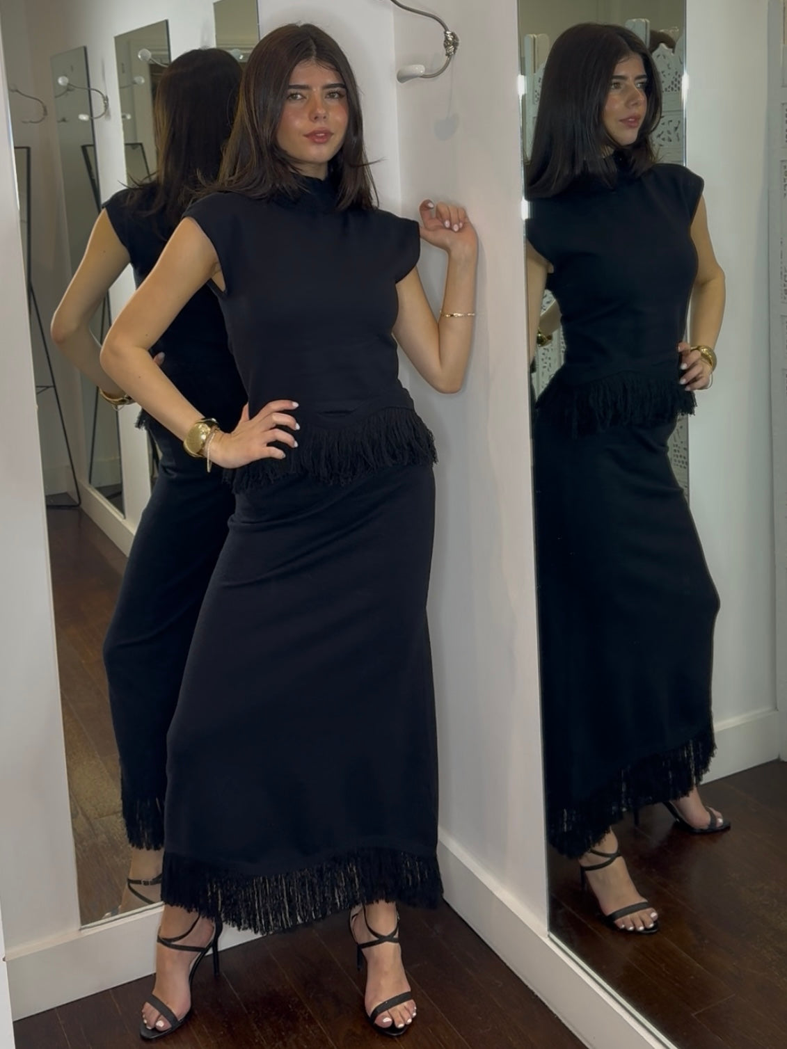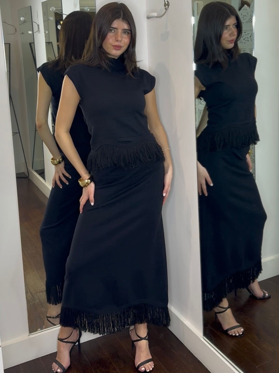 SEQUIN SPLIT SKIRT SHEER SEQUIN PETAL TOP SHEER SEQUIN PETAL PALAZZO TULIP APPLIQUÉ SKIRT ORLENDINA FRINGE MIDI SKIRT BLACK