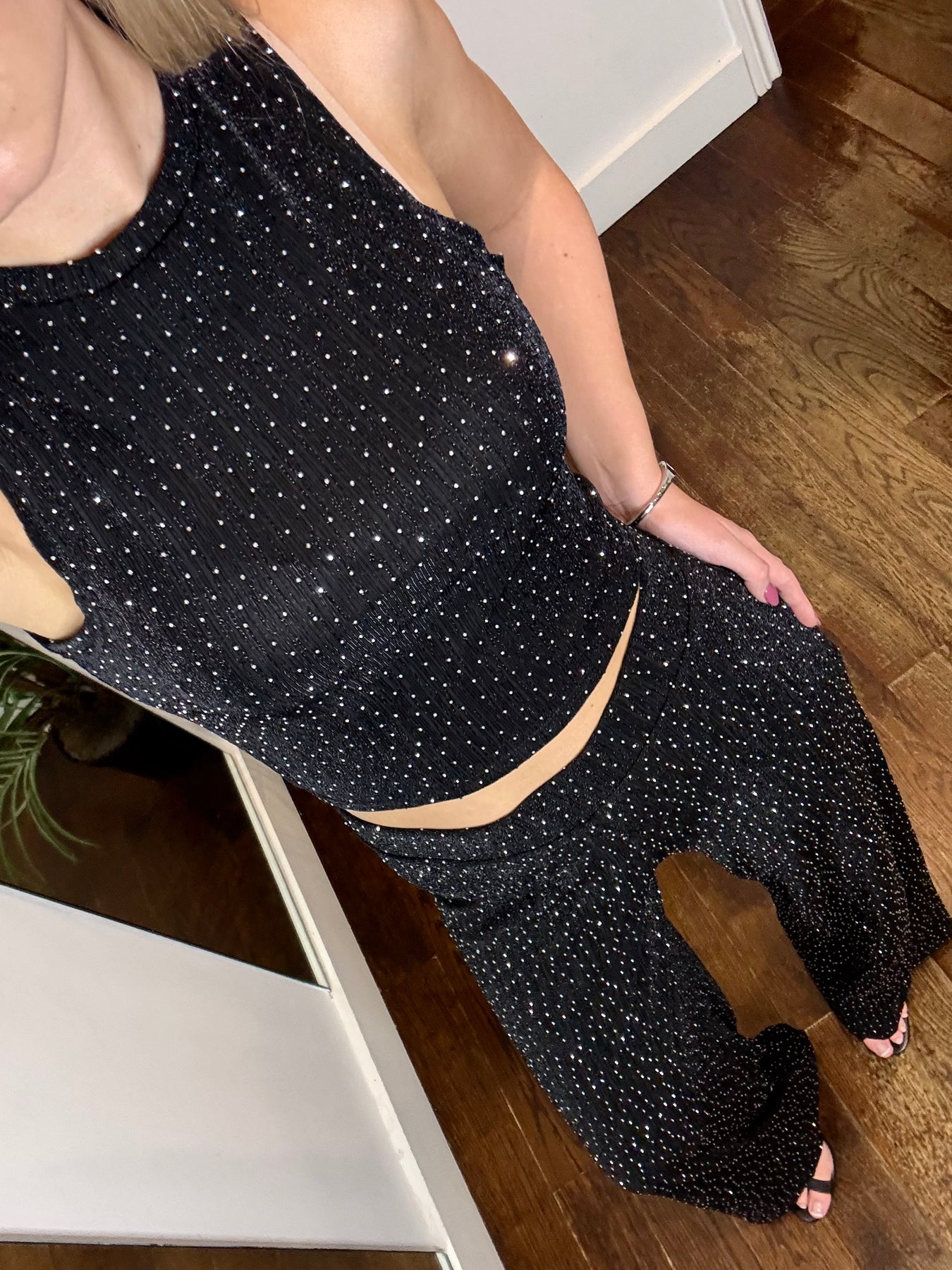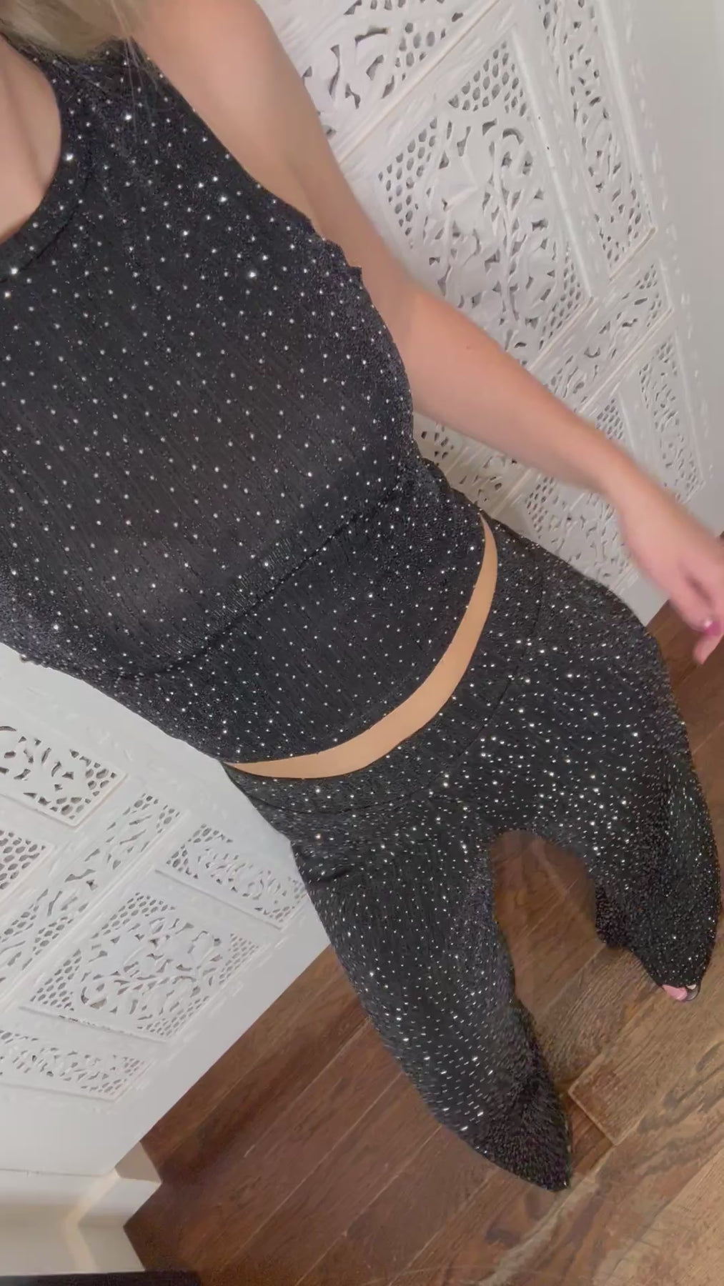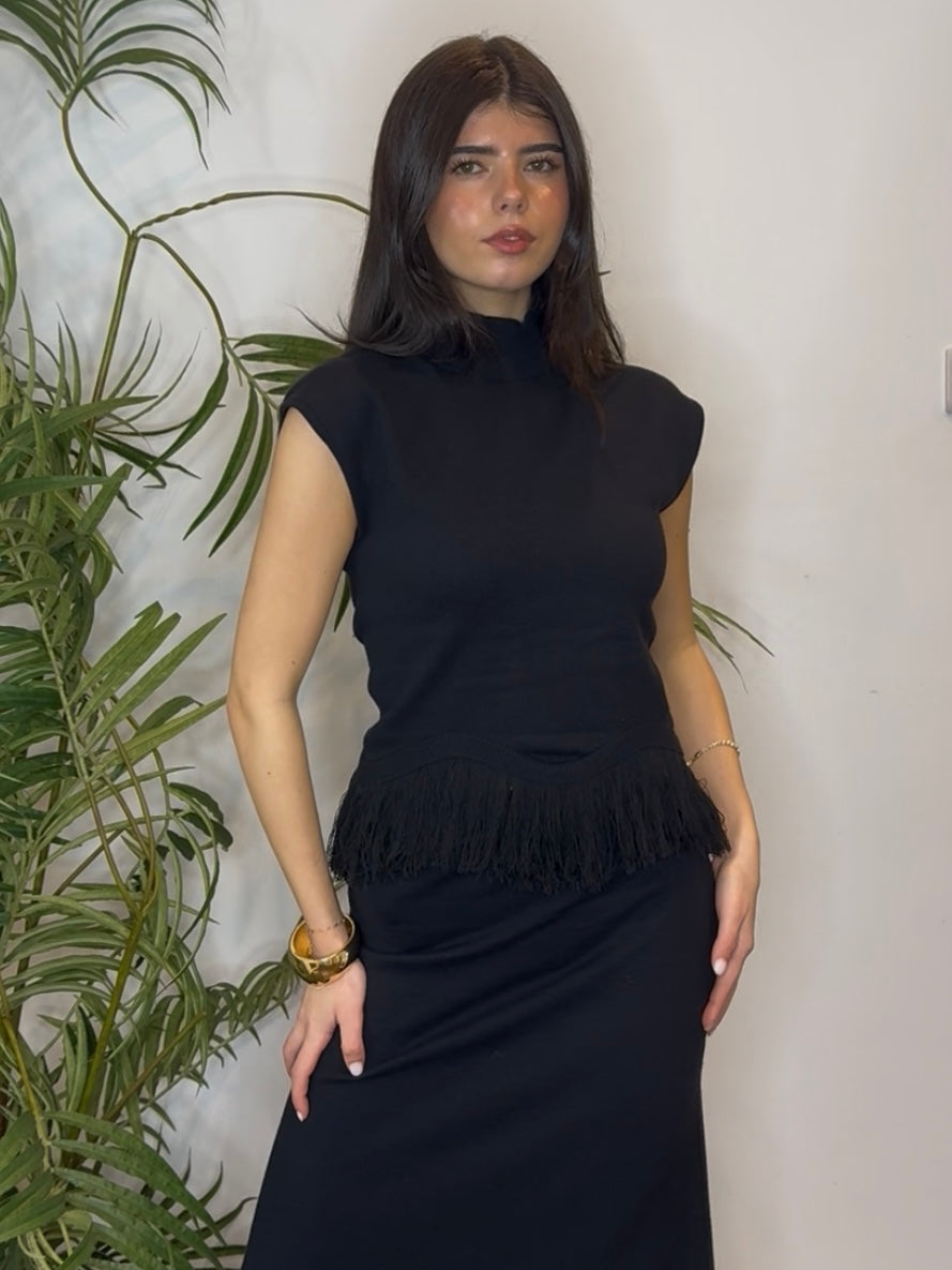 SEQUIN SPLIT SKIRT SHEER SEQUIN PETAL TOP SHEER SEQUIN PETAL PALAZZO TULIP APPLIQUÉ SKIRT ORLENDINA FRINGE MIDI SKIRT BLACK