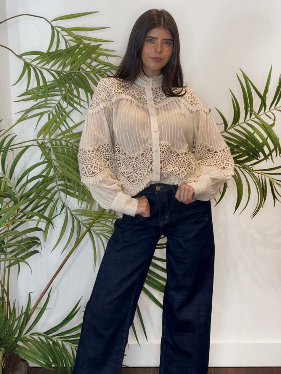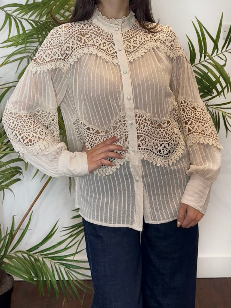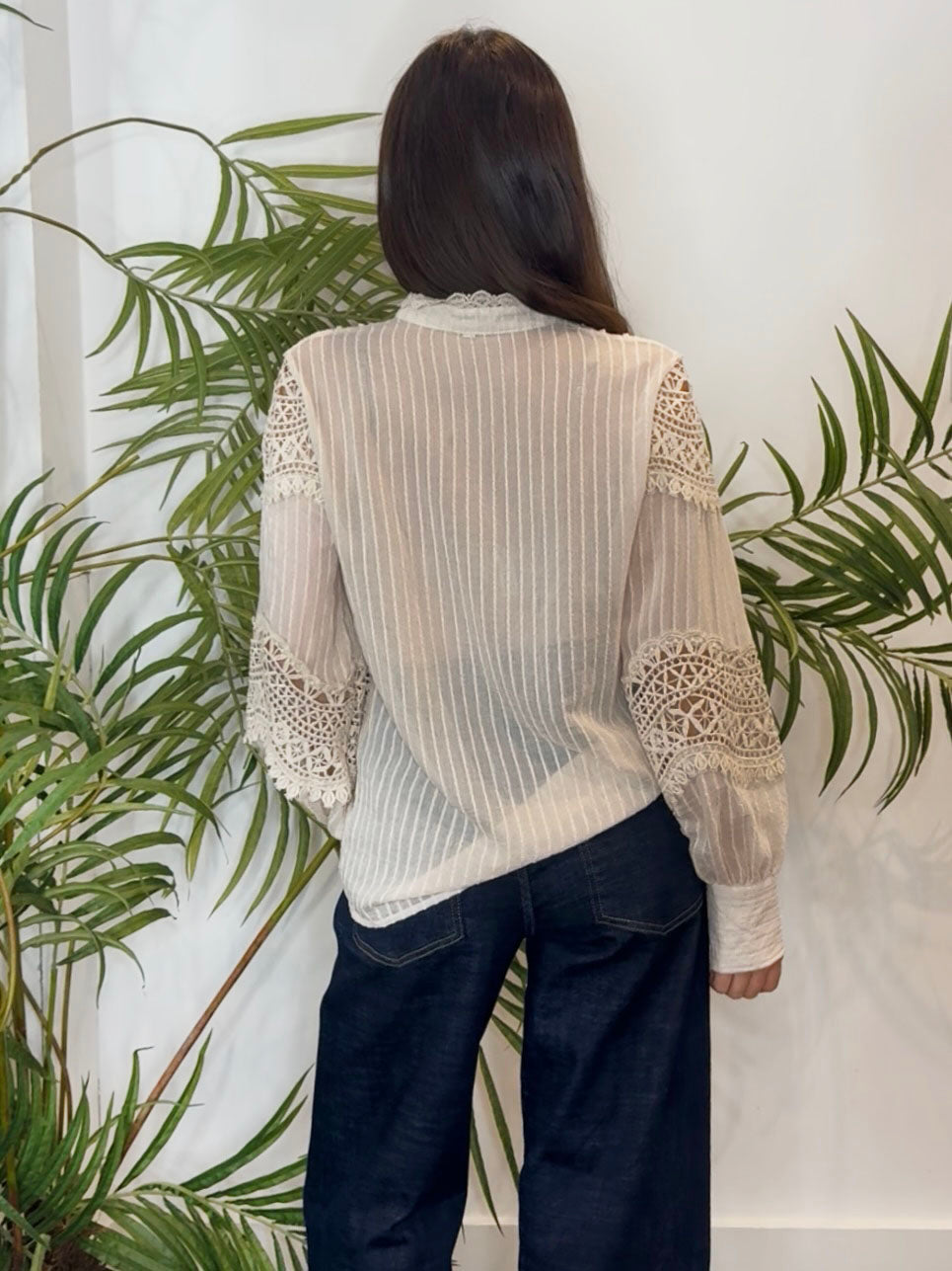 Regular price £40.00Semi sheer self stripe blouse with lace insert detail.