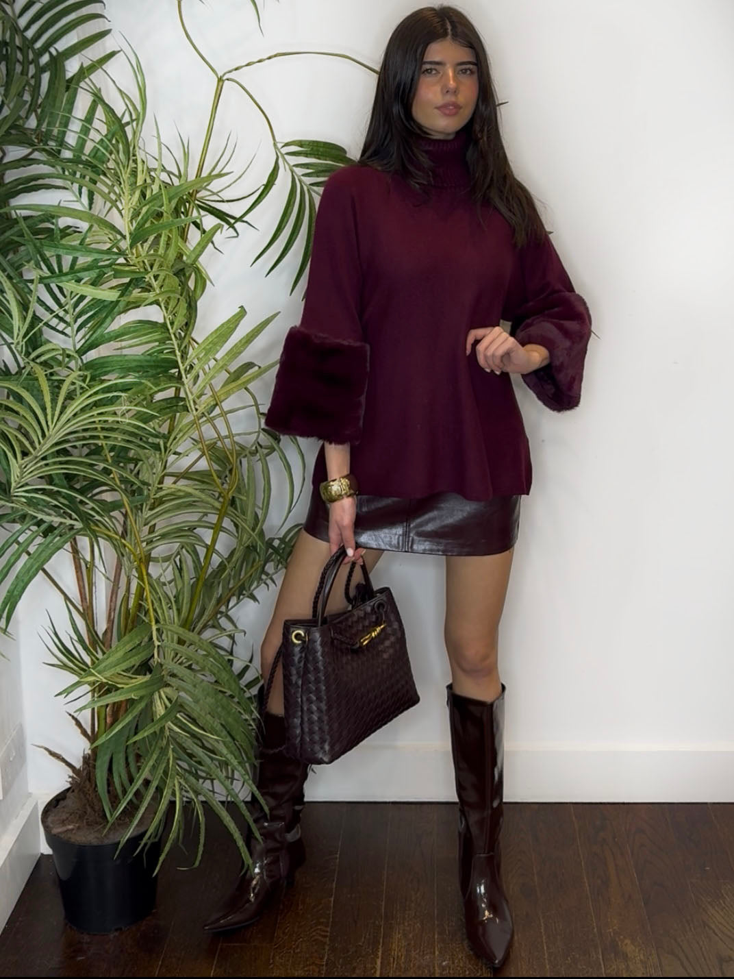 FAUX FUR SLEEVE POLO KNIT BERRY